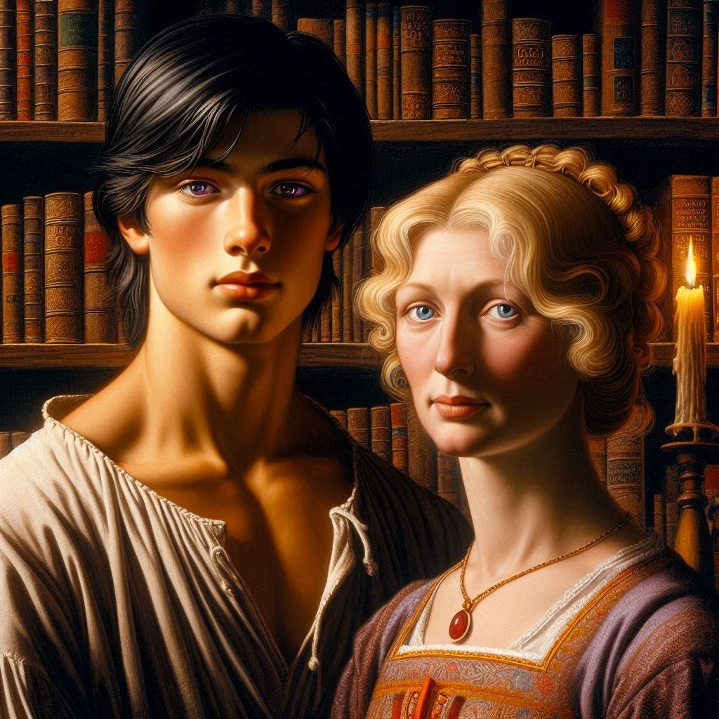 Beside him, the beautiful older woman with her blonde hair woven like a coronet and clear blue eyes radiated a calm elegance. They stood in a grand library, surrounded by shelves of old books. The painter had captured their likeness with fine details and delicate brushstrokes, making the painting seem almost lifelike despite its age.