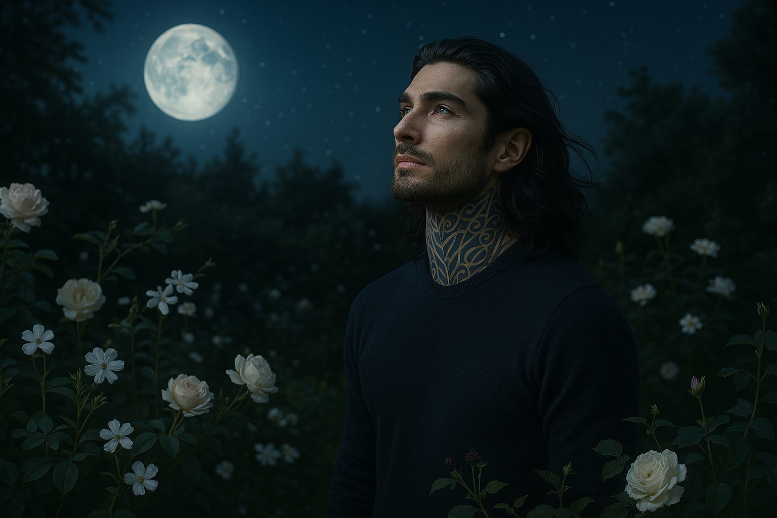The sun had set, it was a cool summer night. The campion and primroses were blooming. Delicate, small white flowers sprinkled among the brilliant glow of glorious white roses. The starlit sky shared with a gigantic full moon. As I walked out into the garden, lost in thought, I barely noticed him. He stood, his gaze on the starlit sky. I took a moment to study him—this being who had lived for centuries, had experienced joy, pain, sadness, happiness, and suffering over several lifetimes in no small measure.