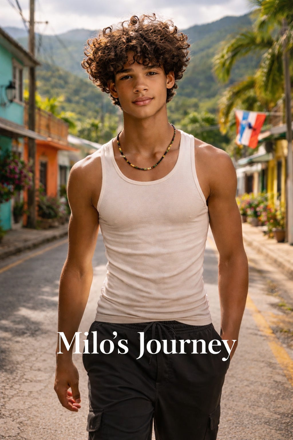Milo Santiago stood beneath the shade of a towering palm tree, his dark, curly hair catching the faintest breeze that blew through the quiet streets of Jayuya. His lean, athletic build was a testament to his active life. In the mornings before school, and most afternoons upon his return, Milo toiled on his parents’ modest farm. When he wasn’t tending to the land, he offered consultas—readings to the villagers—for extra income. This financial support was crucial when the farm’s crops struggled to flourish.